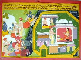 | Description / विवरण | Miniature painting based on Harivansha. In the left part, Satyabhama is depicted asking Krishna for Parijaat. In the right part, story of Parijaat haran is depicted, Krishna carrying the tree on Garuda. |