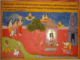 | Description / विवरण | Miniature painting based on Kashi khand depicting scene of Kashi Nagari. On the left of painting a sage seated in Padmasana and on its left Shiv giving blessing to his worshipper. |