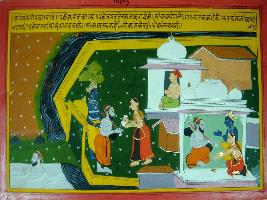 | Description / विवरण | Miniature painting based on Harivansha depicting Narad bathing in river water in the bottom right corner, near the entrance of a city, Narad is given water by Rukmani and Krishna is standing besides him. In the left below both Krishna and Rukmani are receiving blessings of Narad. |
