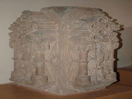 | Description / विवरण | This architectural member bears two figure on its two side. This piece has Kuber in tribhangi posture. His face is broken and has two hands. One hand bears a pearl Thali . An animal is standing below him. Other figure is of Isan. It has four hands with ayudhas. A bull is standing behind him. This architectural member is richly carved. |