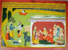 | Description / विवरण | Miniature painting based on Harivansha depicting Narad Muni coming to palace of Krishna and Rukmani and shown giving her ornaments. In the left part, she is showing the ornaments to other females. |