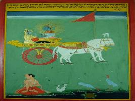 | Description / विवरण | Miniature painting based on Shri Bhagwat Gita. It depicts Krishna preaching Arjun those who could control over his senses they have stable mind same as stable tree with a strong roots. |