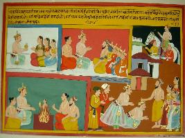 | Description / विवरण | Miniature painting based on Eklinga Mahatmya depicting Dashrath welcoming a rishi. They perform a yagna and receive a sacred pot, he gives the pot to his three wives, by which he gets four sons- Ram, Lakshman, Bharat and Shatrughana. |
