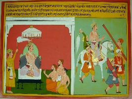 | Description / विवरण | Miniature painting based on Eklinga Mahatmya depicting Dashrath-a Suryavanshi, having all capabilities, serves his people and was on throne for 10,000 years but without any child so calls Rishi Vashishth and asks him for a solution. Rishi suggests him to call Shringi Rishi and perform Putresti yagna. king rides on horse and moves ahead to bring rishi Shringi. |