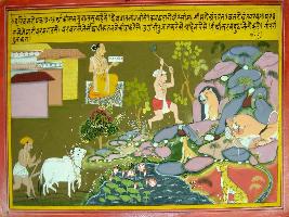 | Description / विवरण | Miniature painting based on Harivansha depicting a Brahman in the upper portion of the painting while a man is ploughing in the field in the below right side. In the left side a man is cutting tree for fair wood and a tiger killed him. |
