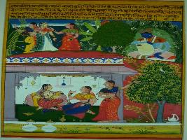 | Description / विवरण | Miniature painting based on Rasikpriya depicting Krishna in love with Radha and sitting in a bower. Radha is shown sitting with her friends in a palace at lower level and being told about his condition and then going to meet him. |