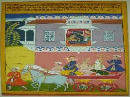 | Description / विवरण | Miniature painting based on Rasikpriya depicting Virah vedna , the pain of separation of Radha with Krishna. In upper part, Radha in sad mood is depicted while in lower part, departure of Krishna and Balram in chariot from Vrindavan . |
