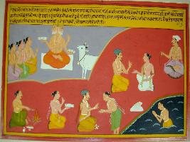 | Description / विवरण | Miniature painting based on Eklinga Mahatmya depicting Prithvi in the form of a cow and goes to Brahma. She asks Brahma to save her from destruction. Then Brahma tells her that she do not have only sinners on her but also pundits, sages and good people whose holy activities will save her. |