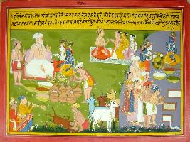 | Description / विवरण | Miniature painting based on Harivansha depicting Krishna and Balram sitting and dining with Nanda. Next to it Indra is seen with Devtas. At the lower right corner, musicians are seen and a man is seen killing a animal. At the left side worshipping of Govardhan is depicted. |