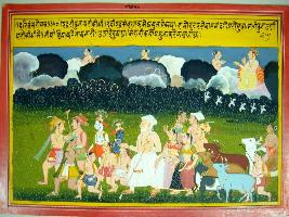 | Description / विवरण | Miniature painting based on Harivansha depicting returning of Nanda with Krishna, Balram and other gopas and gopis after performing Go-puja cow worship . At the upper part god Indra is seen ordering clouds to rain and killed the cow. |