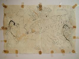 | Description / विवरण | It is an unfinished painting of Durga, shown seated on an lion. Ten armed goddess is shown attacking the composite animal and human form, demon with spear and flanked by Bhairava and Bhairavi, a four armed god and his consort. |