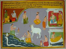| Description / विवरण | Miniature painting based on Eklinga Mahatmya depicting Narad talking to Vayu at the upper right part and tells the seven dharmas of men. Sheshnaag is shown holding earth at lower right part. At the centre, various activities of men are shown -a man reading Veda, worshipping Shiv linga, performing a yagna, taking care of patient, giving daan to needy, doing mediation. At the centre, Kamdhenu cow is shown pouring milk on Shiv linga. |