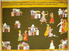 | Description / विवरण | Miniature painting based on Eklinga Mahatmya depicting sins done by men. Two men are sitting and surrounded by houses. At the top left, man is killing his wife. Below this, a man is getting punishment for his sins. |