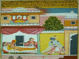 | Description / विवरण | Miniature painting based on Rasikpriya depicting Nayika fallen ill and lying on bed due to immense love and separation with the Nayak. |