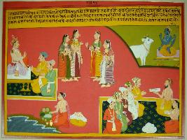 | Description / विवरण | Miniature painting based on Eklinga Mahatmya depicting Krishna telling to Prithvi a story. On top middle, four females are standing and talking to each other, a seated king is discussing with his two ministers. Below in right side, a sage is performing Puja in the river. In the left below a rishi is advising a group of royal men. |