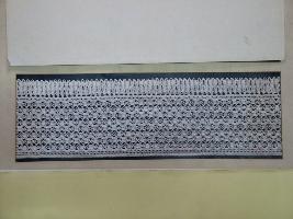 | Description / विवरण | This is a Nottingham machine made lace, in which four horizontal motif is depicted. From top to bottom. The first one is plain criss-cross pattern, the second one is circular floral pattern, the third one is criss-cross pattern and the fourth one is vertical pointed floral pattern. |