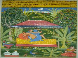 | Description / विवरण | Miniature painting based on Rasikpriya depicting Nayaka and Nayika in loving union under the moonlit night in the garden. |