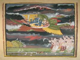 | Description / विवरण | It is a painting depicting Vishnu and Laxmi shown seated on Garuda the bird vehicle of Vishnu. While in the foreground, pond and a group of lady devotee is painted, on background black cloud. |
