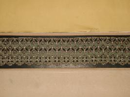 | Description / विवरण | This is a Nottingham machine made coloured cotton fancy lace. This is a very thin net which geometrical floral pattern and leaves pattern is depicted. The top edge is a straight line and the lower edge is wavy line. |