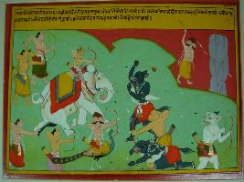 | Description / विवरण | Miniature painting based on Eklinga Mahatmya. It is a scene from Tarakasur Sangram . Indra on elephant and Kartikeya on peacock are leading the Devta s army and fighting with the demons leaded by Tarakasur and he is killed by Shiv s son Kartikeya. |