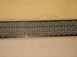 | Description / विवरण | This is a Nottingham machine made coloured cotton fancy lace. This is a very thin net which geometrical floral pattern and leaves pattern is depicted. The top edge is a straight line and the lower edge is wavy line. |