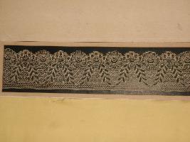 | Description / विवरण | This is a Nottingham machine made coloured cotton fancy lace. This is a very thin net which circular floral pattern and leaves pattern is depicted. The top part is a straight line and the lower part is a wavy line. |
