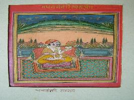 | Description / विवरण | It is a painting of Dhanwantari Swarupam courteous doctor . A garland had shown. A kamandal pitchure like golden pot had shown, holding in right hand. A pillow had shown behind him. Pillow is cylindrical in shape. He is sitting on bed. |