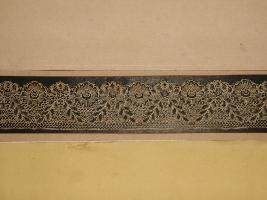 | Description / विवरण | This is a Nottingham machine made coloured cotton fancy lace. This is a very thin net which circular floral pattern and leaves pattern is depicted. The top part is a straight line and the lower part is a wavy line. |