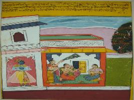 | Description / विवरण | Miniature painting based on Rasikpriya depicting Krishna standing in right part while in left part Radha is depicted with her companion and an attendant. |
