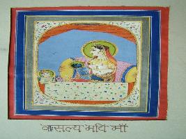 | Description / विवरण | It is a paintings of vatasalaya mayee Ma. She is decorated by ornaments and garments. Garland is white. A pillow is shown. Pillow is large in size. She is sitting on bed. Two end edge is yellow in colour. The pillow is cylindrical in shape. |