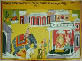 | Description / विवरण | Miniature painting based on Eklinga Mahatmya. Vayu is depicted telling to Narad. king of Chitrakuta is depicted with on attendant and sitting on throne and three people, a horse and an elephant are standing in front of him. |