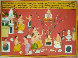 | Description / विवरण | Miniature painting based on Eklinga Mahatmya depicting a king of Dwaparyug at the upper right and offered water by a Naga purush. On the top, Indra is depicted sitting on an asana. At the centre, the king is depicted performing yagna and snakes are falling in the fire. Next to him, Eklinga is being worshipped by Takshak snake and a female. |