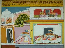 | Description / विवरण | Miniature painting based on Rasikpriya depicting Krishna looking out of a palatial window where Radha is sitting at the extreme right side of the painting. At the left part, Krishna is shown sitting inside a palace at lower part. Radha is shown sitting with her friend at upper left part. |