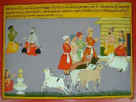 | Description / विवरण | Miniature painting based on Eklinga Mahatmya depicting at the upper right corner Vayu in green body telling Narad holding a veena about Kamdhenu. Kamdhenu is sitting with Vashishth and Arundhati, and Vishwamitra is coming to meet them and giving him a cow in exchange of Kamdhenu. Then Kamdhenu runs away from them and comes to Eklinga ji for help. |
