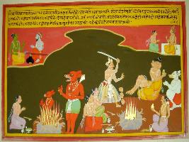 | Description / विवरण | Miniature painting based on Eklinga Mahatmya depicting Vayu and Narad in conversation at the upper right corner. At the upper left side Indra is giving boon to Prajapati to have a three headed son. The lower part shows the three headed son performing yagna in favour of demons. Then Indra kills him, by cutting his three heads. |