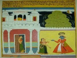| Description / विवरण | Miniature painting based on Rasikpriya. Krishna is standing outside Radha s house and she is mesmerized by his good looks. |