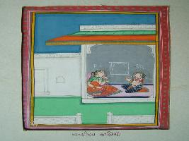 | Description / विवरण | It is a painting of discussing female friends. They are sitting in front of each other. Sky is shown above the palace. One is sitting on knees. |
