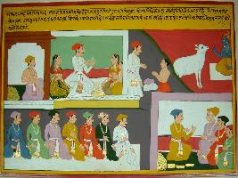 | Description / विवरण | Miniature painting based on Eklinga Mahatmya depicting Krishna telling to Prithvi that the good attributes should be added in life. A king is shown given donation to a man, he is talking with a group of women. Below right a group of courtiers are seated in a row. |