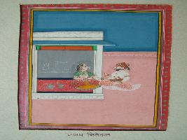 | Description / विवरण | It is a painting of Pranay Nivedan Request . Heroine is touching thigh of hero. Ornamental decoration is shown on both hero and heorine. Hero is wearing turban on head. |