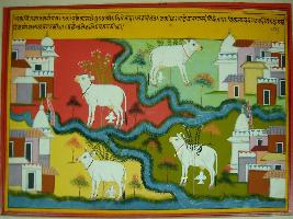| Description / विवरण | Miniature painting based on Eklinga Mahatmya depicting Shiv linga at different places by Kamdhenu, Firstly Kamdhenu reaches Prayaga and Mahadev is established, after that Vishwanath established at Varanasi, Somnatha established at Dwarika and many other Linga established at different places. |