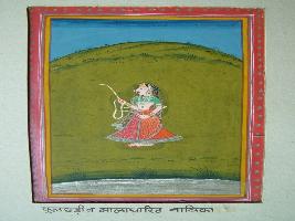 | Description / विवरण | It is a painting of flower stick and garland wearing heroine. She is holding a flower stick in right hand. Sky is shown. |