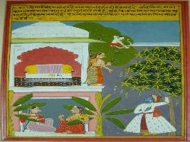 | Description / विवरण | Miniature painting based on Rasikpriya depicting Krishna waiting in the garden for Radha. While in the right side Radha is being narrated about his condition by a friend. On the top Kamdev is visible with his bow and arrow. |