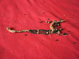 | Description / विवरण | Necklace of small glass green and brass beads at regular intervals. Badly broken. |
