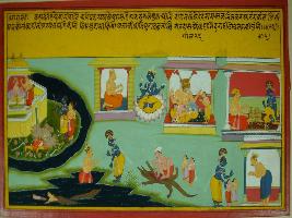 | Description / विवरण | Miniature painting based on Krishna charitra - Sur Sagar depicting Rag Nata, Ragini of Rag Deepak. At the left side coronation of Ram is depicted after Ram and Lakshman killed Ravan. Next to it, towards left Vishnu appears before Surdas. Next to it Narasimha avatar of Vishnu is depicted. At the lower part a man killed a crocodile and take out two Brahmans from his stomach and Krishna left them at their home. On the upper left Krishna drinking with a man. |