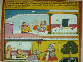 | Description / विवरण | Miniature painting based on Rasikpriya depicting an the upper part Radha and a friend are sitting in a balcony with a decorated bed in the wait of her lover in the moonlit night. At the lower part Krishna is depicted arriving at Radha s palace, where she is sitting with her friends. |