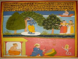 | Description / विवरण | Miniature painting based on Krishna charit - Sur Sagar depicting Rag Goki on the upper part Krishna is depicted playing flute with two women standing nearby, on the lower part Surdas is depicted playing Manjeera and a man playing dhol and a snake lifting a hill on his hood. |