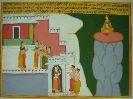 | Description / विवरण | Miniature painting based on Eklinga Mahatmya depicting Parvati with her attendants in palace. Later two Shiv ganas giving Shiv s message to Parvati. On top left part of painting, Parvati is in meditation on a mountain. |