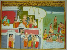 | Description / विवरण | Miniature painting based on Eklinga Mahatmya depicting Shiv and Parvati in loving union in the upper right corner, in the painting it shows that Brahma, Vishnu, Indra and some other Devtas coming to meet Haragauri. In the left side a bathing seen is depicted. |