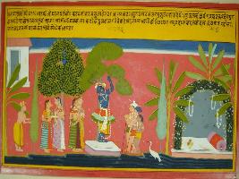 | Description / विवरण | Miniature painting based on Krishna charitra - Sur Sagar depicting Rag Akaan. Krishna is depicted playing flute and he is surrounded by gopis and gopas. |