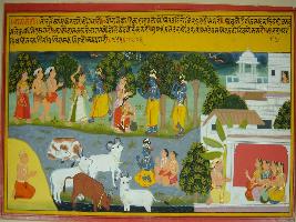 | Description / विवरण | Miniature painting based on Krishna charitra - Sur Sagar depicting Rag Todi the Ragini of Malkosh. On the painting Krishna is seen along with his pals teasing gopis. In the left side a man is talking about the importance of Rag Todi to four ladies. |
